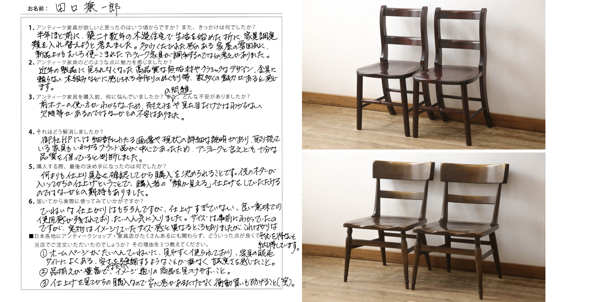 田口兼一郎様、この度は当店にて柏木工のダイニングチェア2脚と九州民芸のチェア2脚をご購入いただき、誠にありがとうございました。
