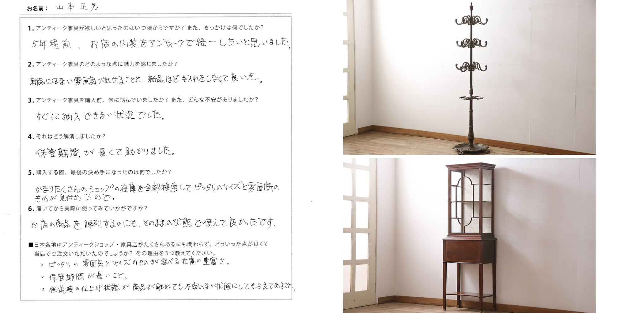 山本正男様、この度は当店にてフランスアンティークのポールハンガーとイギリスアンティークのガラスキャビネットをご購入いただき、誠にありがとうございました。