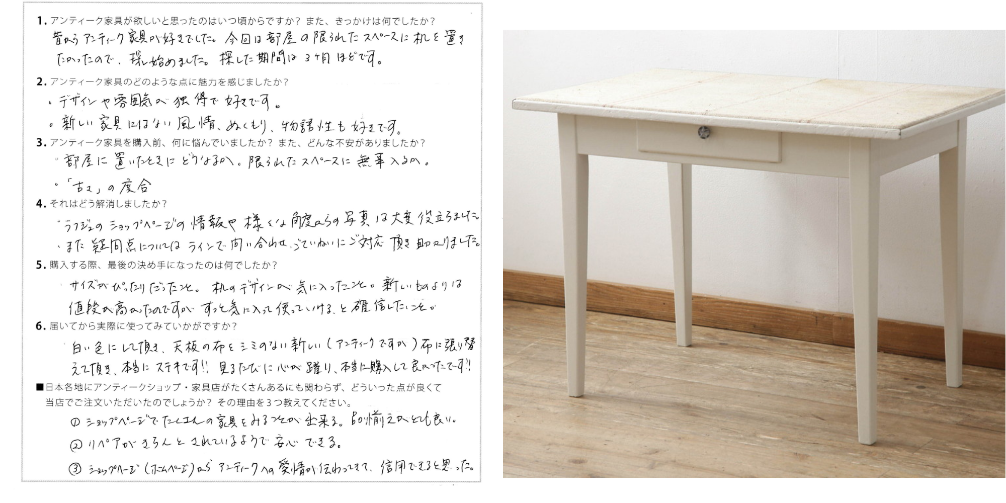 この度は、フランスアンティークのペイントデスクをご購入いただき、誠にありがとうございました。限られたスペースに合うデスクを3か月かけてお探しになられたとのこと。最終的に当店の家具をお選びいただき、嬉しい限りです。