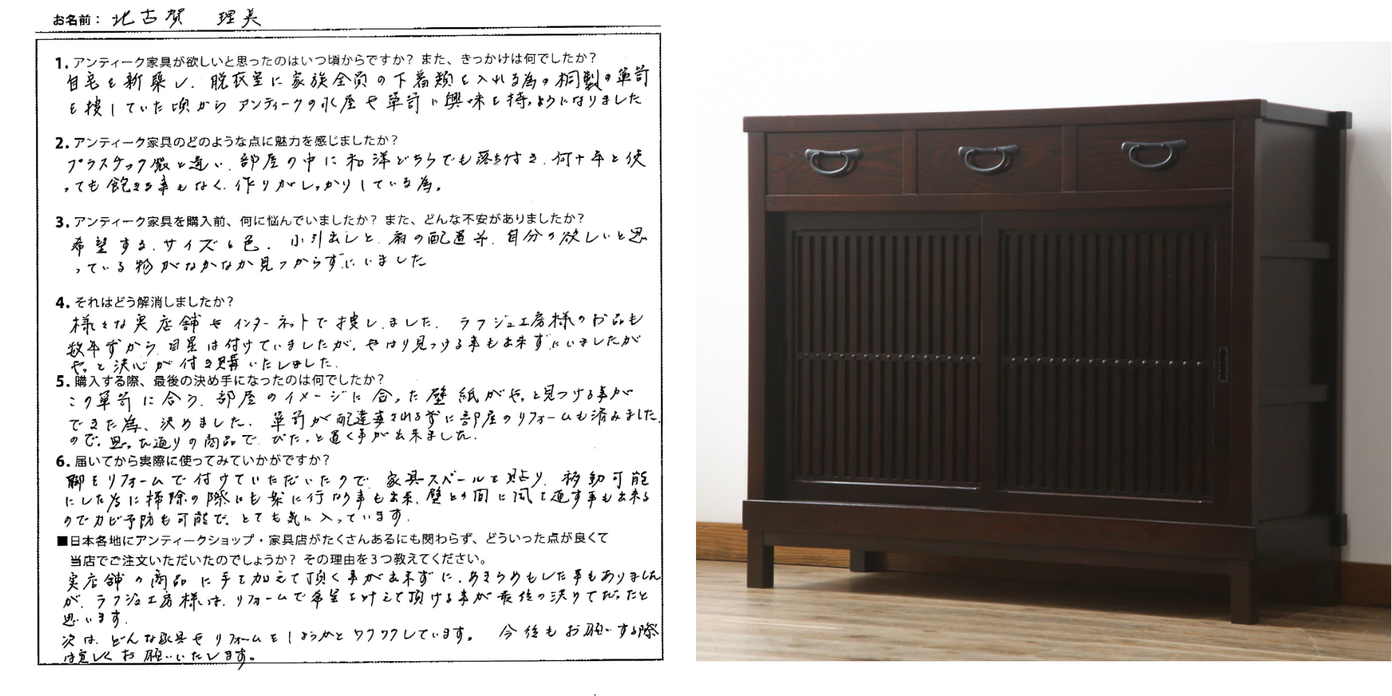 北古賀様、この度はラフジュ工房にて水屋箪笥のご購入およびカスタムサービスをご利用いただき、誠にありがとうございました。