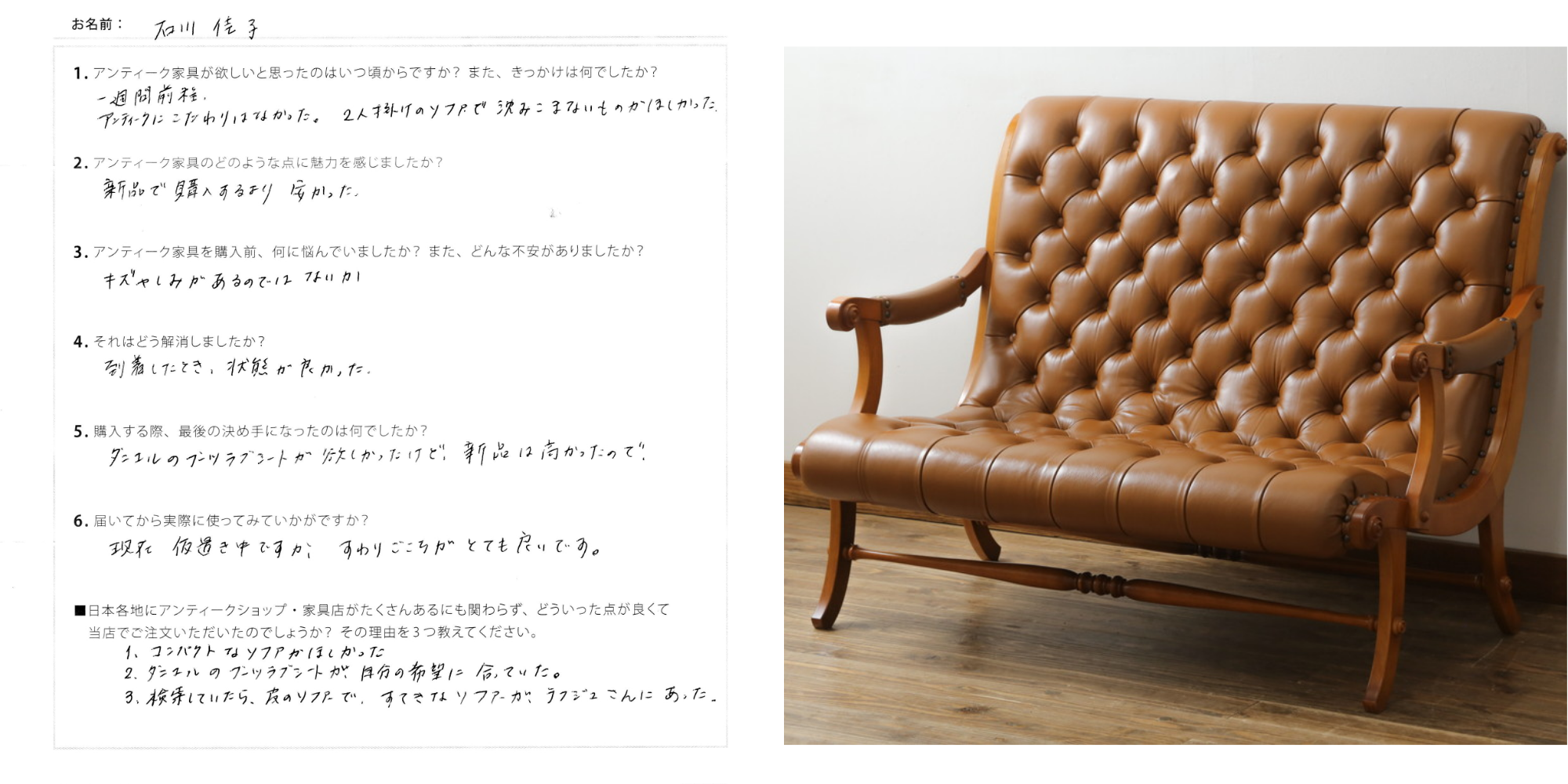 また「状態が良く、座り心地もとても良い」とのお言葉を頂戴し、安心いたしました。アンティーク家具は一点ものだからこそ、お客様にとってベストな一品をお届けできるよう、写真や説明を充実させることを心掛けております。