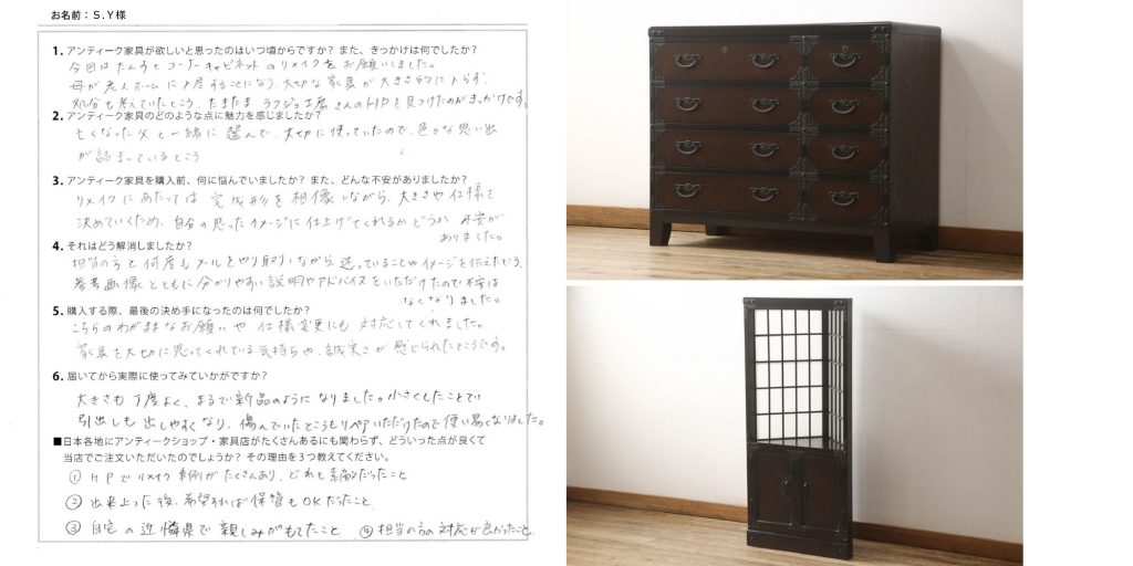 この度は家具の大きさや仕様を変えるリメイクをさせていただきました。完成した実物をご覧いただくまでは、イメージ通りに仕上がるかどうかご不安に思われる部分もあったかと思いますが、担当の者と何度もやり取りさせていただく中で、そうした不安なお気持ちを少しでも和らげることができ、担当の者をはじめスタッフ一同とても嬉しく感じております!