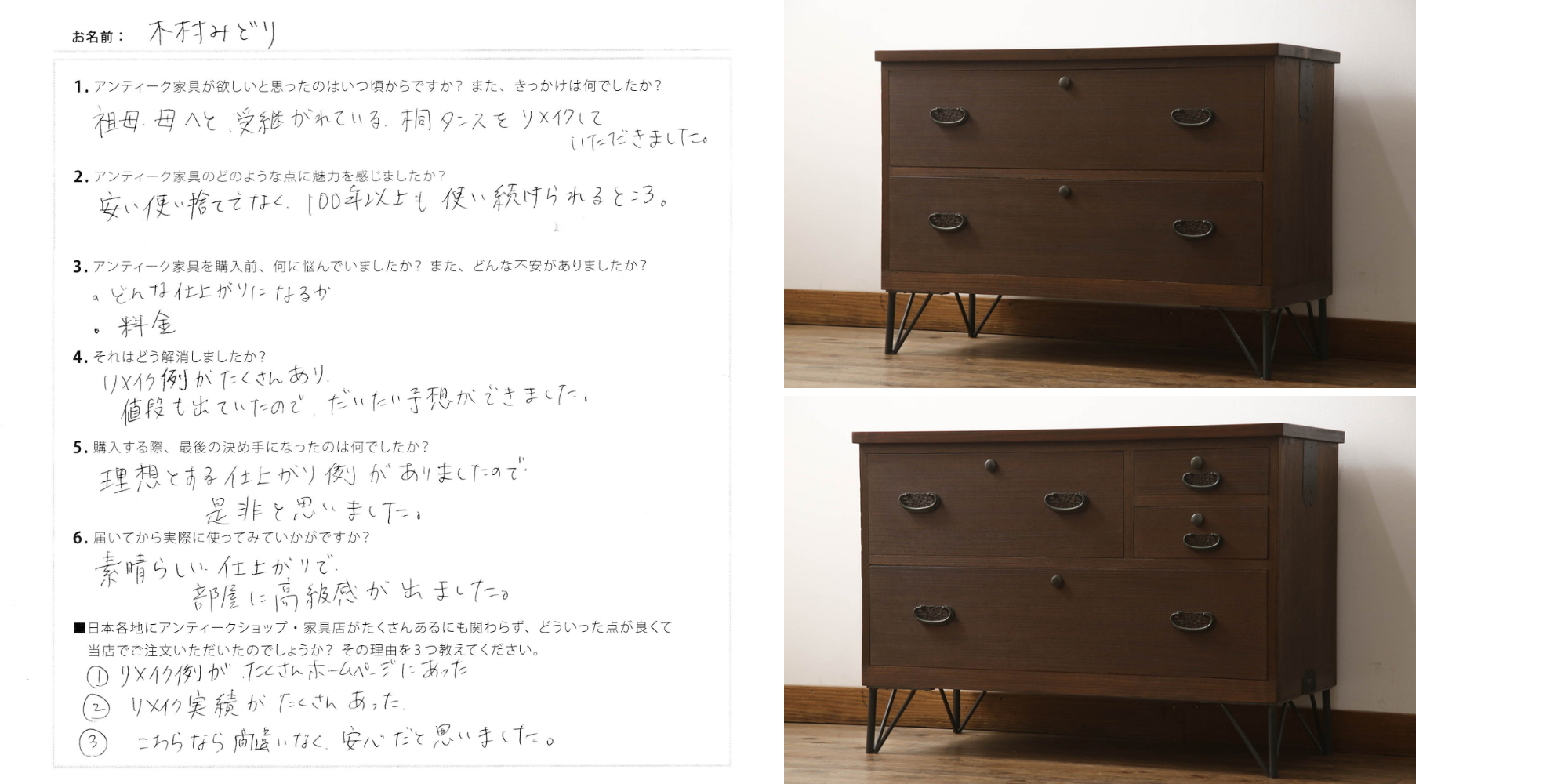 祖母・母へと、受け継がれている桐タンスをリメイクしていただきました。