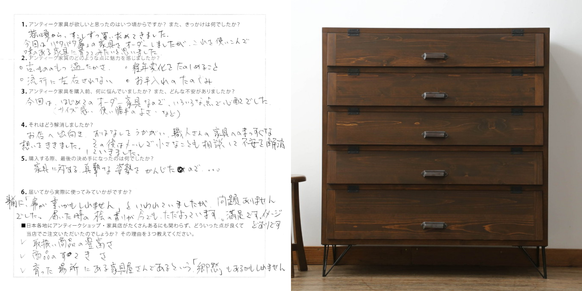 またご購入前は当店へとお越しいただきありがとうございました。初めてのオーダー製作家具でご不安に思われることも多々あったかと存じますが、職人の家具に対する熱い思いを感じていただけたことや、当店スタッフとのメールでのやり取りが安心感に繋がったとのことでとても嬉しく思っております。