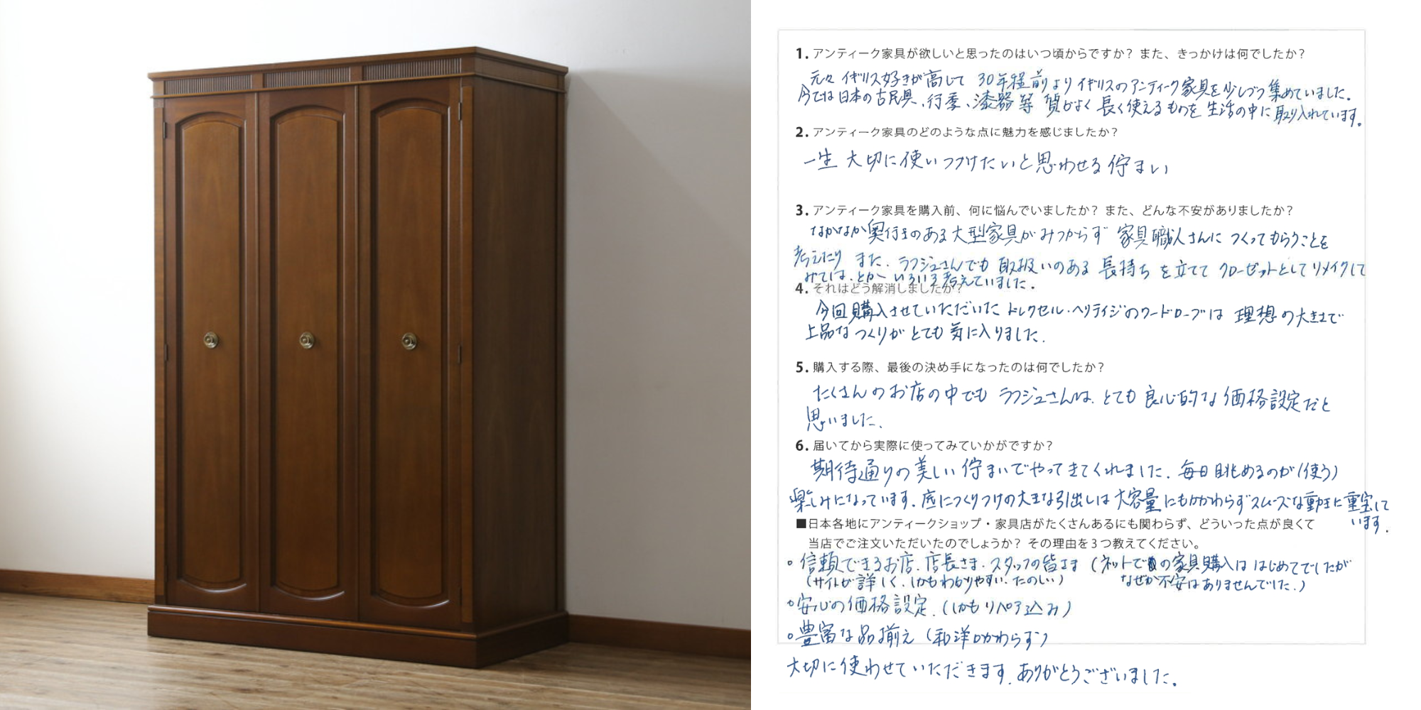今回購入させていただいたドレクセルヘリテイジのワードローブは理想の大きさで上質なつくりがとても気に入りました。