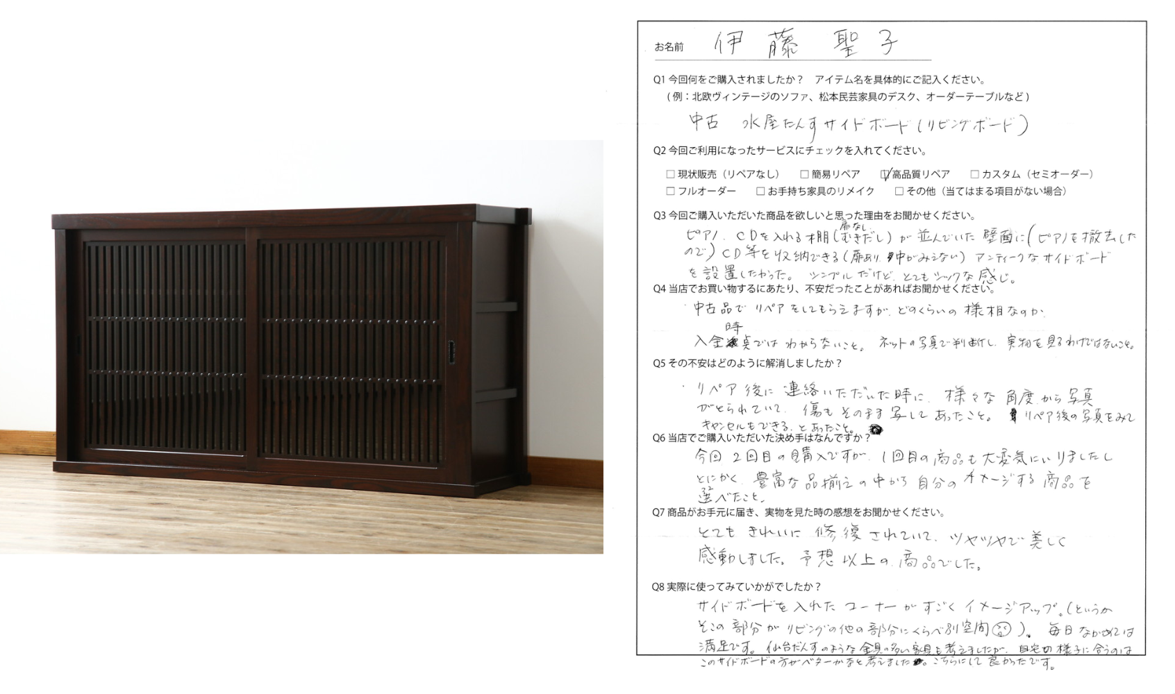 水屋箪笥サイドボードをご購入いただいた伊藤聖子様より、アンケートにご回答いただきました。