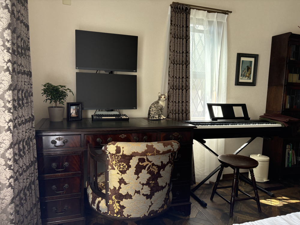 デスクもラフジュ工房で購入しました。洋館の雰囲気が好きで、そんな感じにして行きたいと思っています。