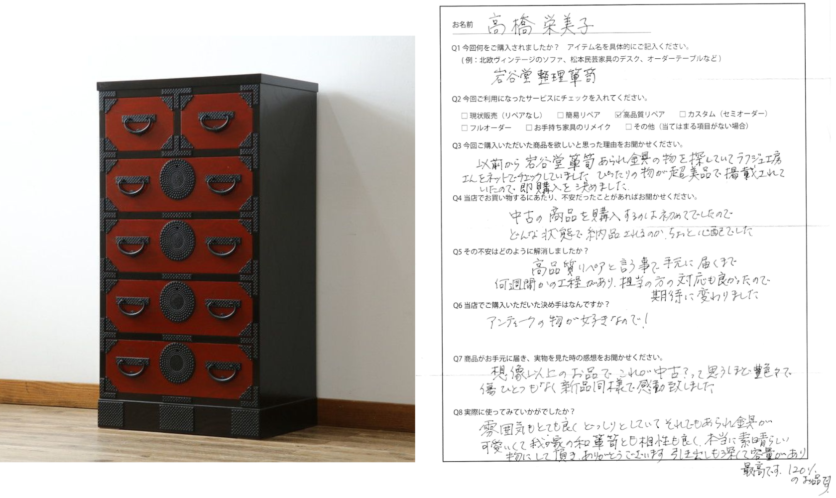 長くお探しだった “あられ金具の岩谷堂箪笥” を当店で見つけていただけたとのこと、大変嬉しくアンケートを拝見しました!
