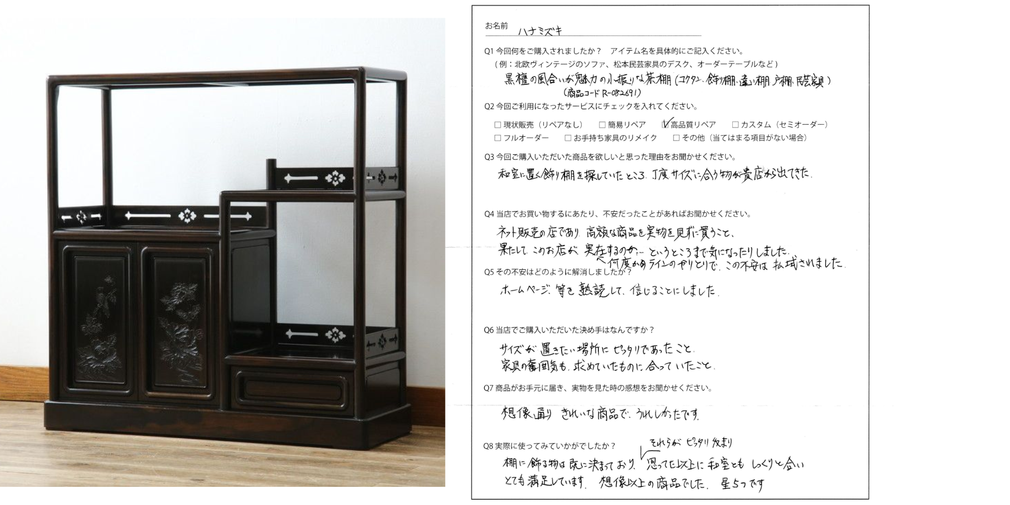 和室に置く飾り棚を探していたところ、丁度サイズに合う物が貴店からでてきた。