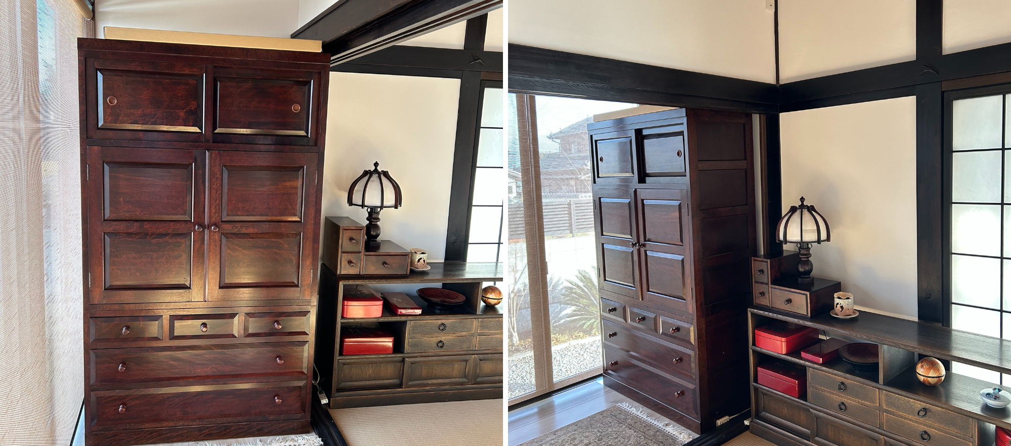 明治時代に建てられた歴史あるお住まいに、D型タンスが自然に溶け込んでいて、「ずっとそこにあった家具」のような佇まいがとても印象的ですね。