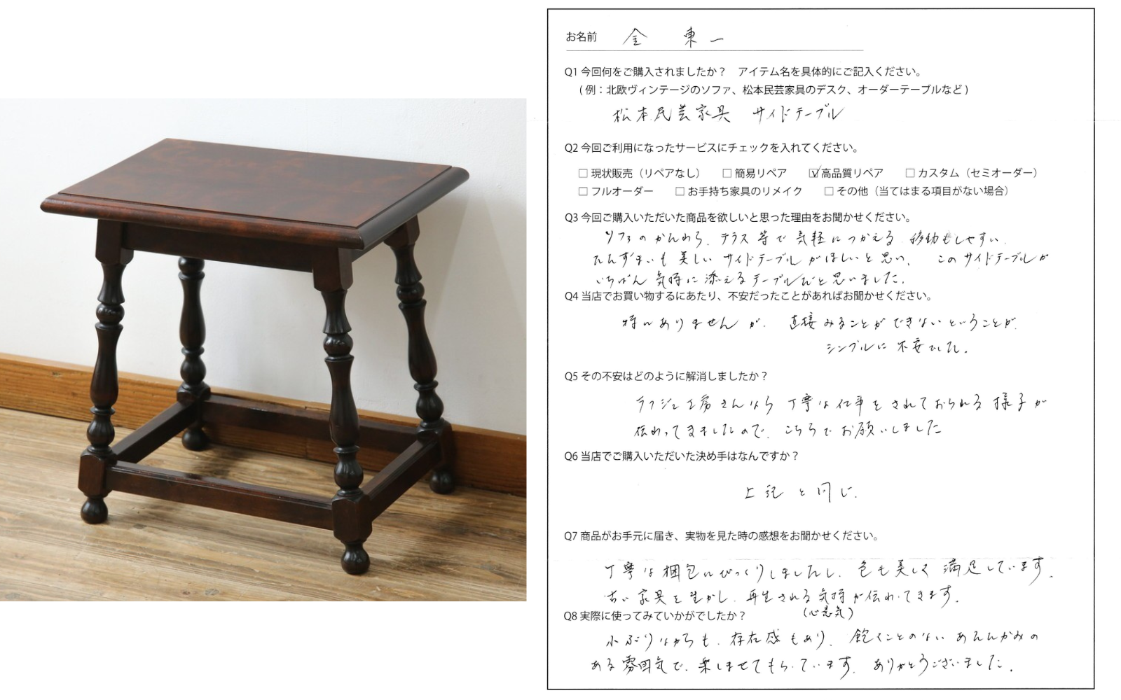 【お客様のレビュー】金東一様 中古 松本民芸家具 サイドテーブルご購入「楽しませてもらっています」