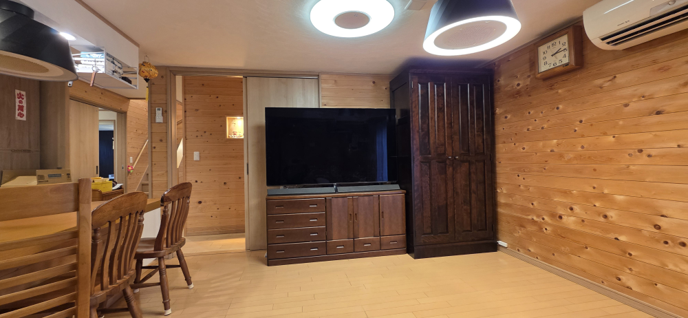 壁や床の木肌のやさしい雰囲気の中で、松本民芸家具ならではの落ち着いた存在感がほどよいアクセントになっていますね。まるで以前からそこにあったかのような佇まいが印象的です。