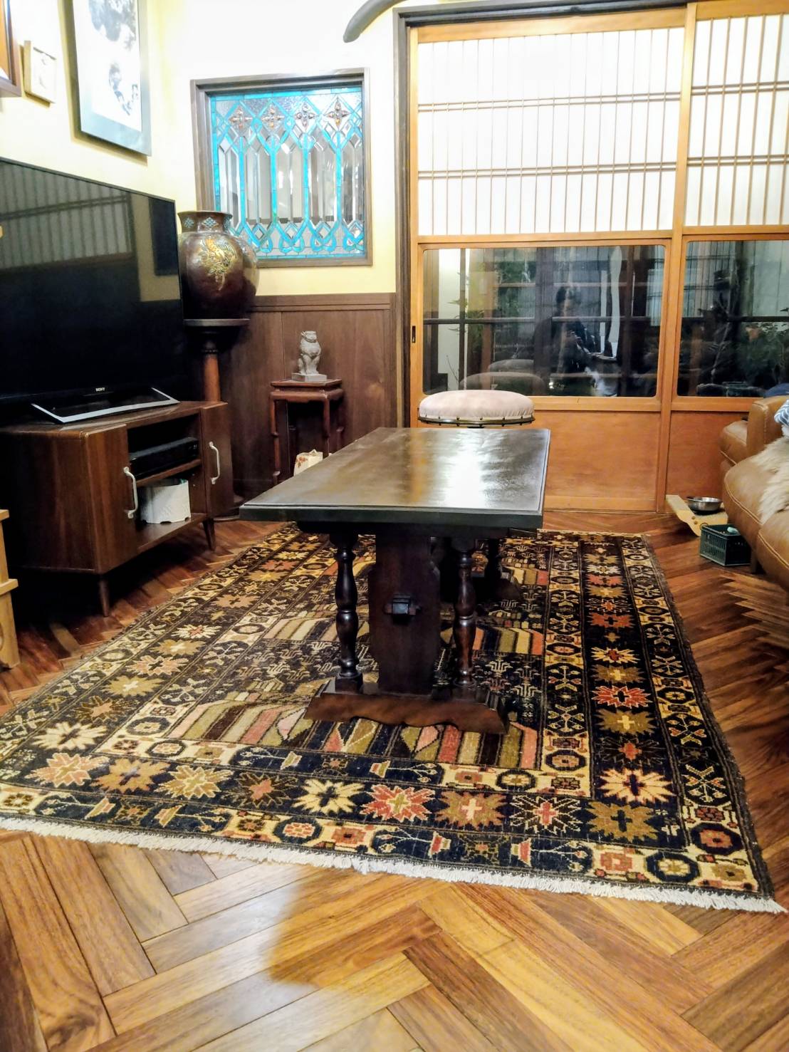 深みのあるテーブルの風合いが、お部屋全体の落ち着いた雰囲気ととてもよく調和していますね。ヘリンボーンの床や存在感のあるラグとも相まって、温かみのある上質な空間に仕上がっているのが印象的で素敵なお部屋ですね…!