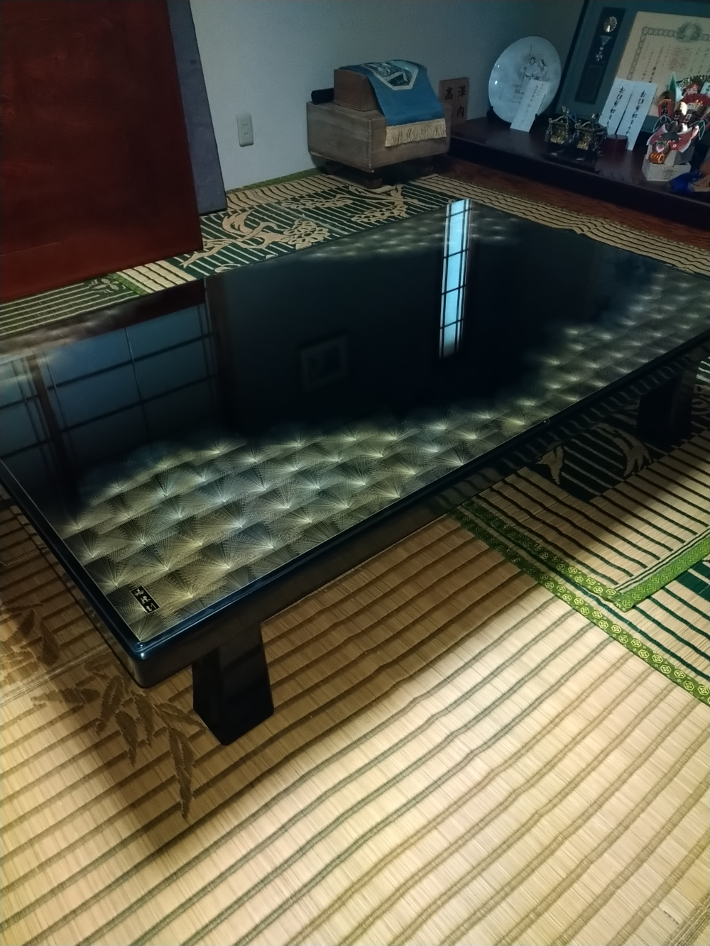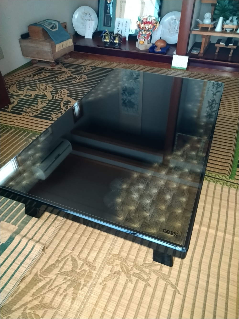 お写真を拝見し、和室に美しく馴染んでいる様子に思わず見入ってしまいました。畳の上に映る艶やかな天板や繊細な模様が、落ち着きのある中にも華やかさを添えていてとても素敵な空間ですね!