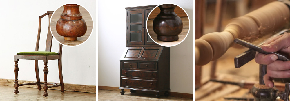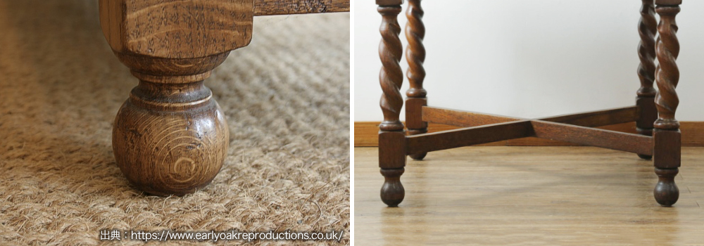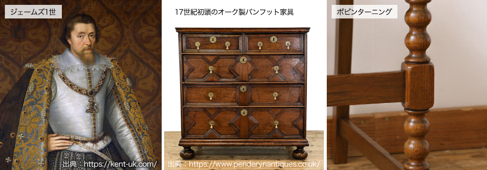 当時ジェームズ1世が王位についていたイギリスでは、オーク材を使って重厚感と上品な華やかさを持つジャコビアン様式で家具が作られていました。ジャコビアン様式といえば「ボビンターニングレッグ」というデザインが誕生した時代でもありますが、挽物細工が盛んであったこの時代の後期頃にバンフットは生まれたとされています。