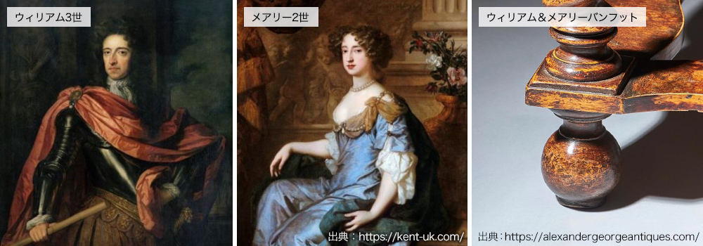 その後カロリアン様式、そしてウィリアム&メアリー様式へと時代が移り変わると、家具の素材はウォルナット材が主流となっていきます。イギリスを共同統治していたウィリアム&メアリーはオランダの家具作りの影響を強く受けており、象嵌や寄木細工などの装飾技術に磨きをかけた優美で繊細な家具を数多く作り出していきました。そうした家具の脚部分に取り入れられた綺麗な球体のバンフットは「ウィリアム&メアリーバンフット」と呼ばれ人気を博します。