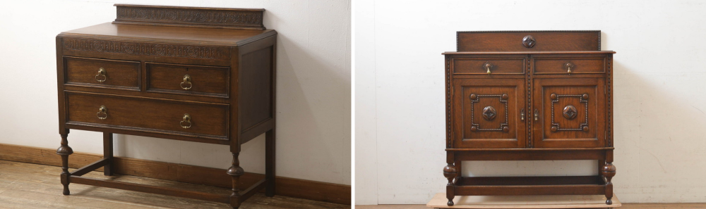 両者の外観は非常に似ているため混同されることが多く、現在の家具メーカーやアンティーク販売者次第では一緒くたにされてしまうこともあります。しかし、収納の引き出しが付いているという共通点はあれ、コンソールチェストは飾り棚やテーブルの要素を持っていることに対し、コモードにはそれらの要素は少なく、あくまで収納のための構造に形成されています。また、コンソールチェストの脚は長く設計されているのに対し、コモードの脚は短く作られています。とてもよく似た作りですが、それぞれの特徴を観察してみると、両者の見分けがつくことでしょう。