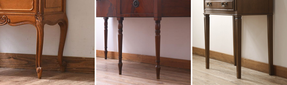 コンソールチェストの脚の形状には、円柱、角柱、猫脚、円錐、角錐形などがあります。ちなみに猫脚(カブリオールレッグ)の脚先には、中国の龍を模したとされる「ボール・アンド・クロー(玉を掴む爪)」や獣の足を模した「パッドフット」のほか、渦巻きやゴルフクラブ状(クラブフット)など、さまざまなデザインが用いられました。