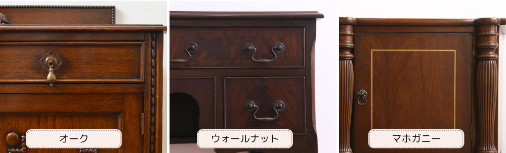 コンソールチェストも使われた材料には、オーク(ナラ)、ウォールナット(クルミ)、マホガニー、サテンウッドなどの木材のほか、大理石、青銅、真鍮などの異素材も使われました。
