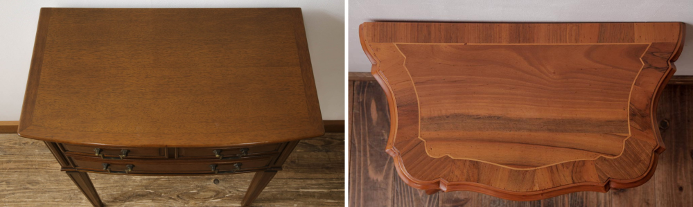 コンソールチェストの天板には、長方形、半円形、楕円形、台形のほか、それらにバロック様式の要素を取り入れた波型に加工されたものなどがあります。