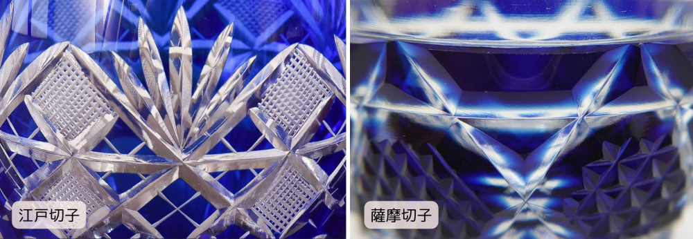 また、江戸切子はパキッとした模様、薩摩切子は「ぼかし」によってじんわり滲んだような模様の雰囲気なのが分かります。