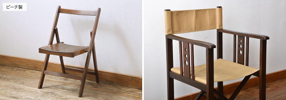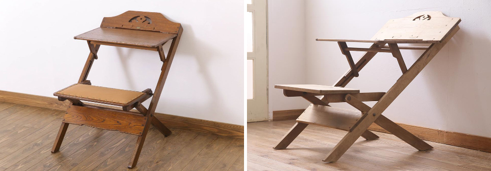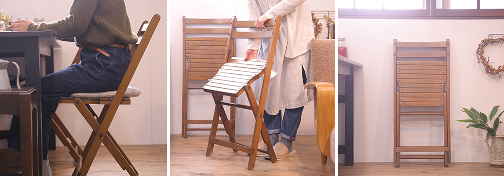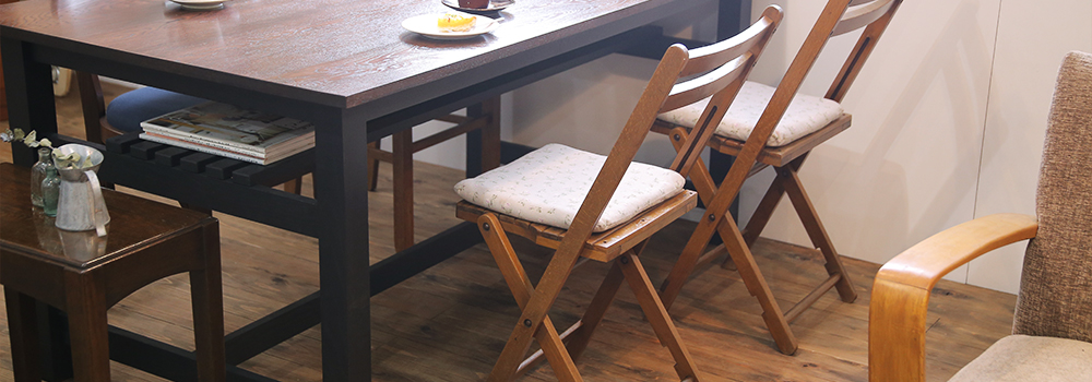 あまり見かけない珍しいタイプですが、折りたたむとスマートに収納できるので、急な来客時などに役立つアイテムです。民芸家具の品は高級感もあって目を引きます。