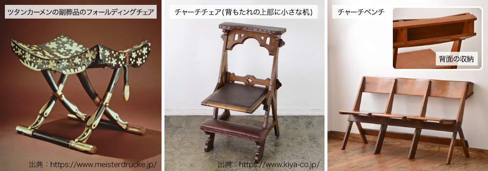 中世になるとイギリスなどでは教会での礼拝時に折りたたみ式の椅子を使用するようになっていきます。そしてフォールディングチェアの背もたれに、背後に座る人のための机・聖書収納スペースなどを備え付けたチャーチチェアが開発され、教会や学校の場で役立ちました。さらに1人用のチャーチチェアだけでなく複数人が座れるような折りたたみ式のチャーチベンチなども作られました。