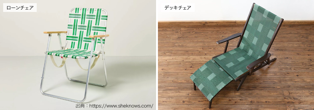 アメリカヴィンテージでよく見かける「ローンチェア」または「デッキチェア」などの座面は、ナイロン製のベルトや繊維を編み込んで作られています。軽量で汚れや水気にも強く、当時はビーチや庭で使用されていただけあって屋外での使用に最適です。