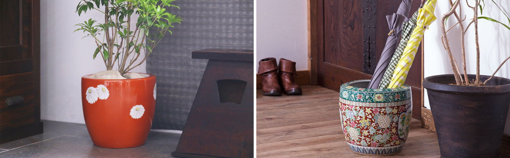 陶磁器製火鉢や木製火鉢に天板をのせてセンターテーブルにしたり、たっぷりとした火鉢の容量と形を活かして鉢カバーや傘立てにしたりすることもできます。