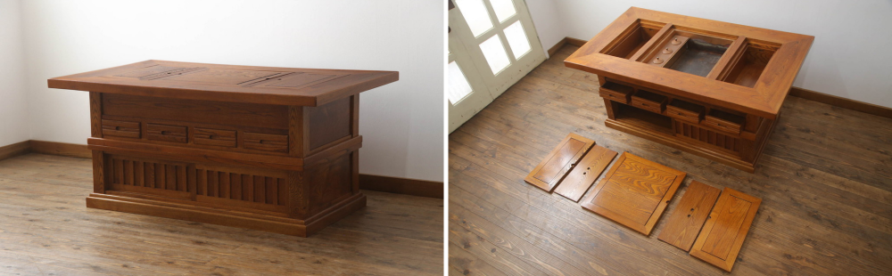 天板の中央に炉(火鉢・囲炉裏)があるテーブルです。高さは床座から椅子を使うものまで幅広く、現代の住宅のダイニングテーブルとしても使えます。関西長火鉢よりも天板が広く、食卓用として作られています。
