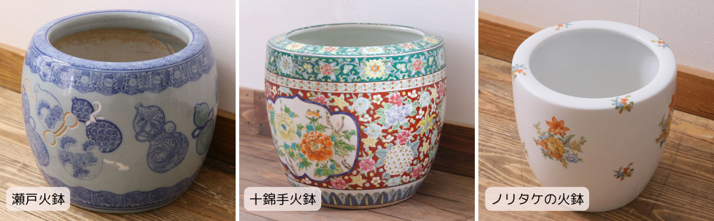 また、陶磁器製の火鉢の中には、「十錦手(じっきんで)火鉢」という中国清朝の焼き物に由来する図柄のものもあります。十錦手火鉢は、青や赤、緑や黄色などの多彩な色を使った華やかな火鉢です。