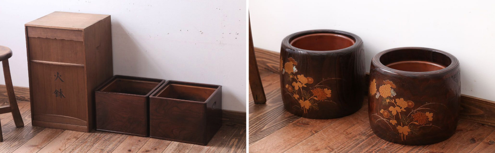 木製の火鉢。形は、丸太をくり抜いた円形の「くりぬき火鉢」や、四角い箱型の「箱火鉢(角火鉢)」、4つ脚テーブルの形をした「大名火鉢」など様々です。