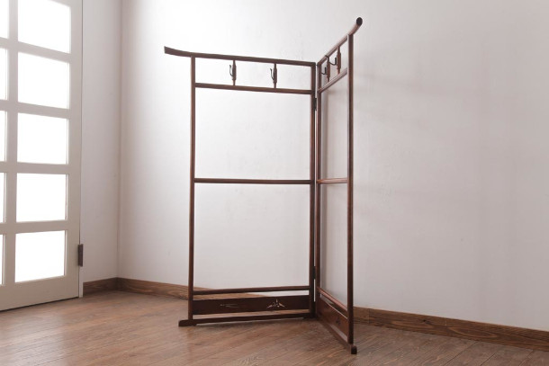 足元に土台の付いた衝立式の衣桁です。着物を折り曲げることなくかけることができるため、着物を一時置きしつつその色柄を楽しむこともできます。現在では、呉服店などで着物の展示に使われることが多くなっています。