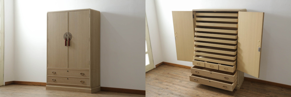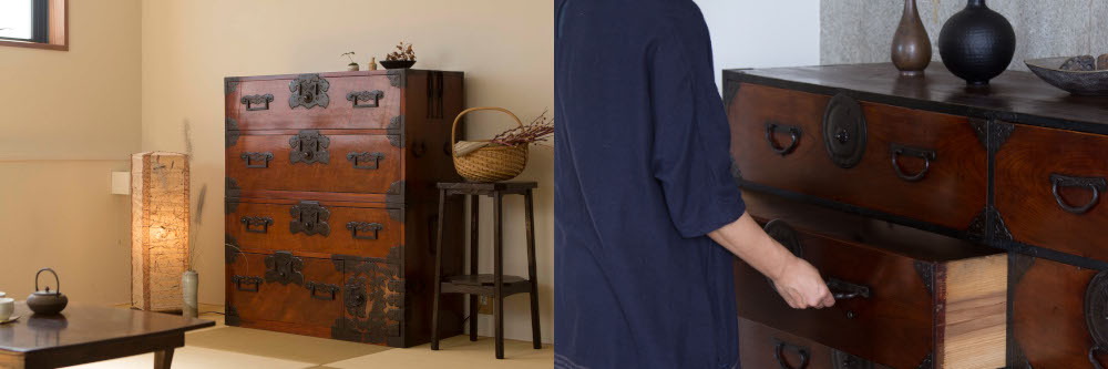日本の箪笥の中でも代表格と言えるのが衣装箪笥です。衣装をしまうための箪笥ですが、主に着物を収納するために作られてきました。長さのある着物をきれいにしまうために、横幅いっぱいの引き出しを備えており、畳んだ着物をそのまま置ける衣装盆が付いているものが多いのが特徴です。