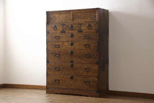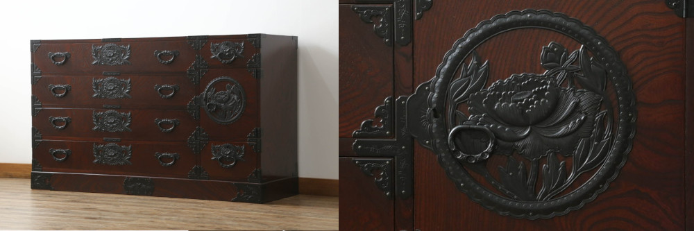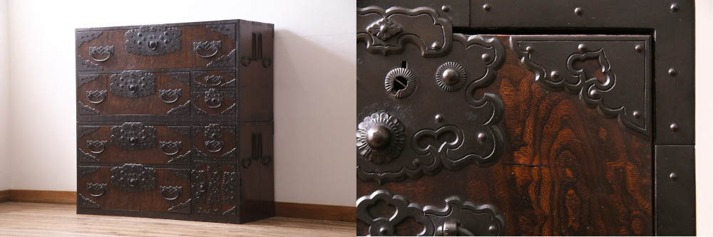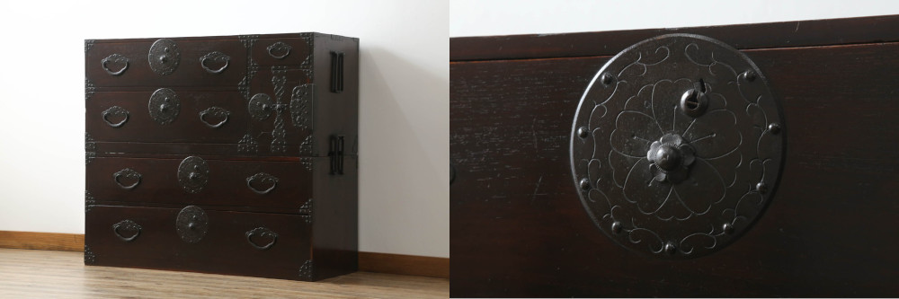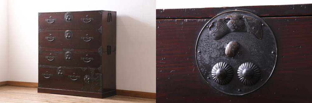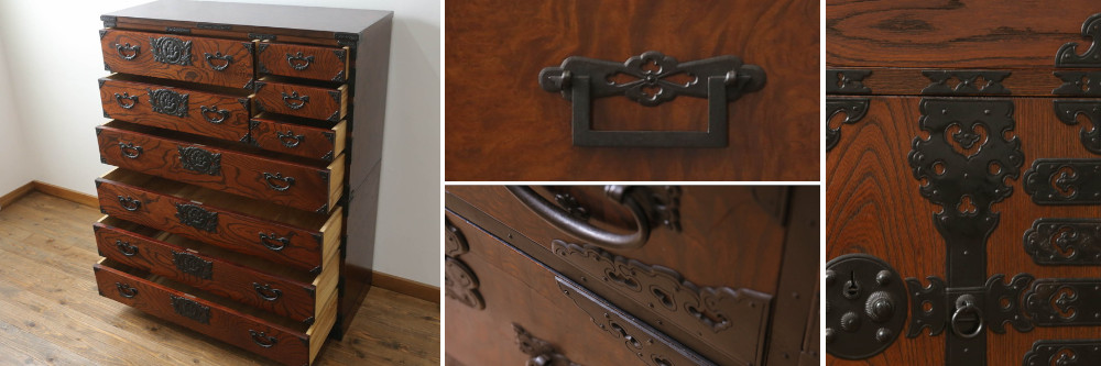 また、衣装箪笥には多くの金具が付けられているもの特徴です。欠けやすい角を補強したり、箪笥の強度を高める働きがありますが、装飾性を高めていることも見逃せません。こちらも箪笥の産地やブランドによってデザインが様々であり、金具の装飾で出どころを見極めることも可能です。