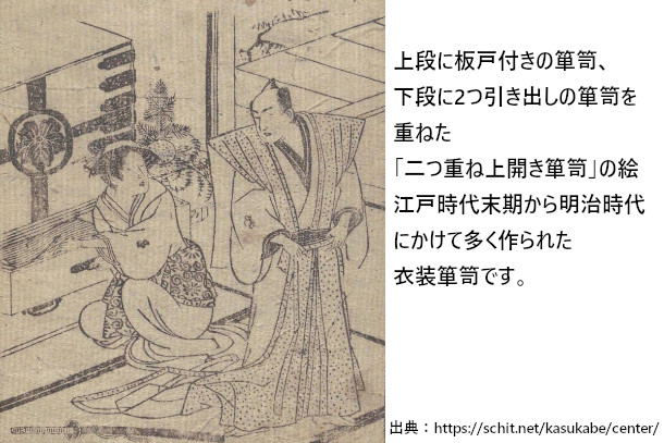 衣装箪笥が初めて作られたのは江戸時代の頃とされています。関西を中心に広まり、上流階級の人を中心に箪笥を持つことが増えていきました。一方、庶民にとっては箪笥はかなり高価なものであり、普段着る服を何着も持つようなことが無かったため箪笥を買うことがなかったようです。江戸末期から明治にかけて人々の生活が豊かになってくると、箪笥が一般の家庭にも普及していきます。こうしてみると衣装箪笥が家庭の必需品になったのは、意外にも近年のことだと分かります。