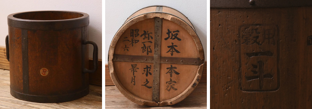 枡の側面には「一斗」と記されており、他の枡と区別しやすくなっています。中には、商標や家紋が描かれたものもあり、実用性だけでなく装飾的な面も見られました。