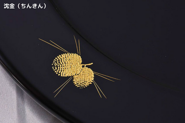 沈金(ちんきん)は、刃物で素地に絵柄を彫り込み、金箔や銀箔、金粉や銀粉などを漆で接着させる技法です。