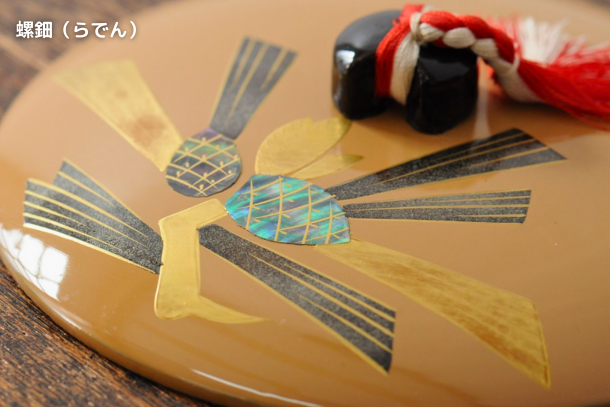 螺鈿(らでん)とは、貝を使った装飾の技法です。漆に彫りこみを入れ、絵柄の形に切り抜いた貝をはめ込みます。貝の種類には、主にアワビ貝やヤコウ貝が使われます。