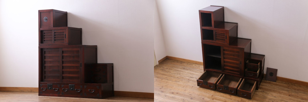 階段の機能を兼ねた収納箪笥です。階段下に収納を設け、狭い家屋でも便利に使われていました。かつては実際に2階に上がるための階段としても作られていたため、非常に堅牢な設計になっています。客人から見える位置に配置することが多かったため、デザインにこだわりをもたせ見せる収納としても活躍していました。独特の形状が趣深く、現在も人気のある時代箪笥です。
