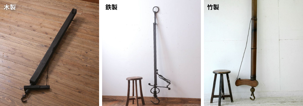 - 鉤(かぎ):支柱の先端に取り付けられ、鍋や釜を引っ掛ける部分