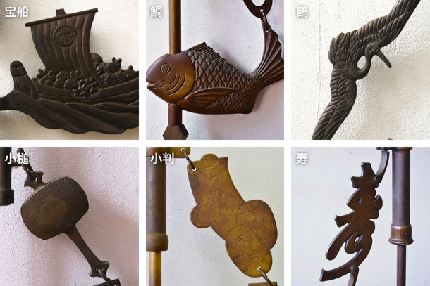 自在鉤は、こだわった意匠が魅力です。作られた時代によっても違いがあり、さまざまなバリエーションが見られます。例えば、江戸時代のものは縁起物のデザインが多く、明治・大正期のものはシンプルな形状が増えるなど、時代背景が反映されているのが特色です。