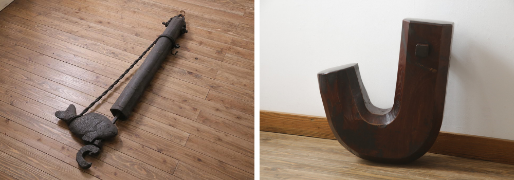 また自在鉤は、動物や吉祥文様などの意匠が施されているのも特徴の一つです。作られた時代によってさまざまなバリエーションが見られます。中でも、鯉や鮎などの魚をかたどった彫刻付きの自在鉤は縁起が良いとされ、特に人気がありました。