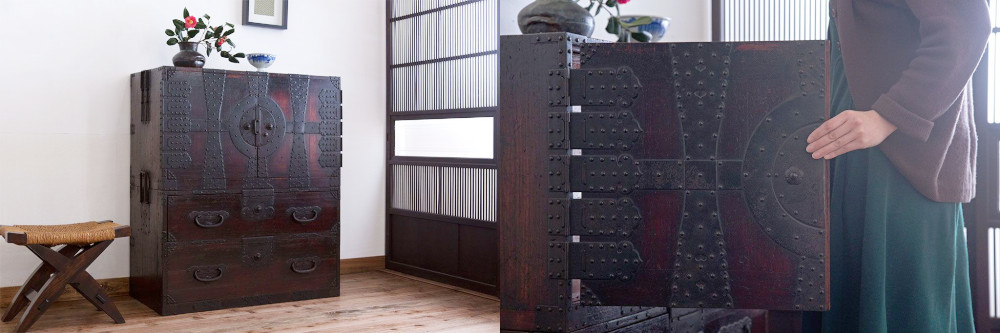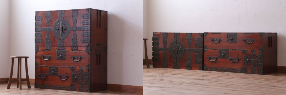 観音箪笥の多くは上下に分かれており、下段は引き出しのみのもの、上段に観音開きの箪笥を重ねます。もちろん上下に分けてローボードのように使うこともできるのが魅了的ですね。高さを出さずとも十分な存在感があるのも観音箪笥ならではです。