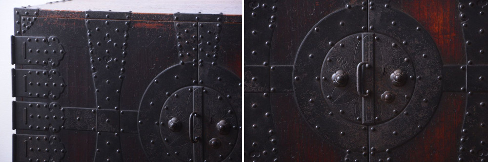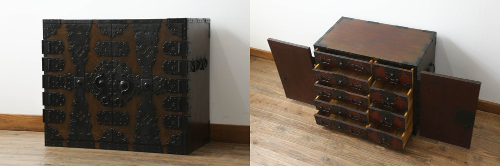 観音開きの箪笥には、金庫箪笥もあります。こちらも観音箪笥ならではの特別な重厚感があるのが特徴です。小ぶりな箪笥ですので、金物のデザインが良く目立ち豪華でありながら渋さも感じられます。