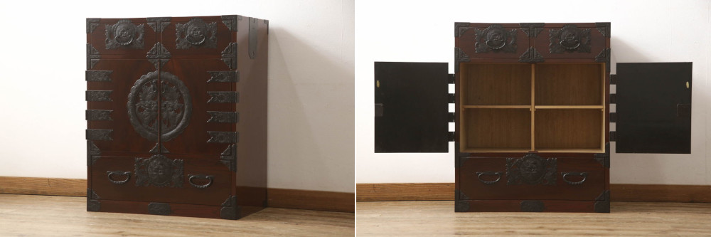 観音箪笥の中では変わった設計で、扉を開くと引き出しではなく棚が備え付けられています。大切な書類や小物などを整理しておくのに便利なデザインですね。