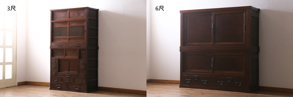 関東水屋箪笥は、3尺サイズから6尺サイズが一般的です。どちらかというと小ぶりの水屋箪笥が多く、住宅事情にマッチした水屋箪笥を生み出していたことが分かります。