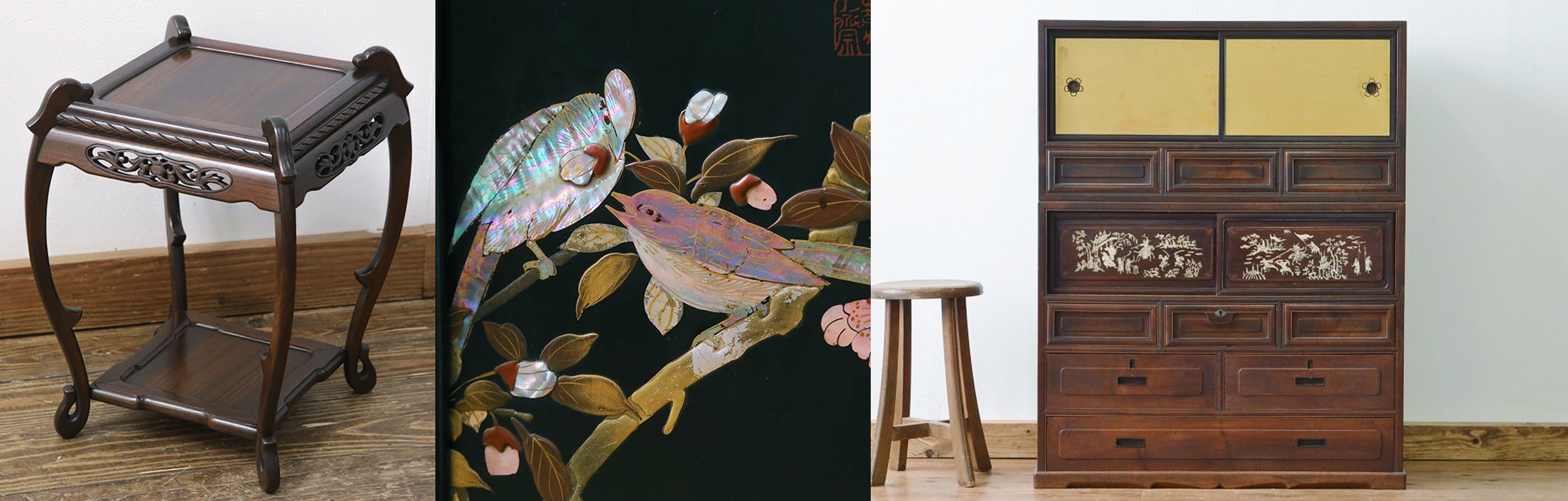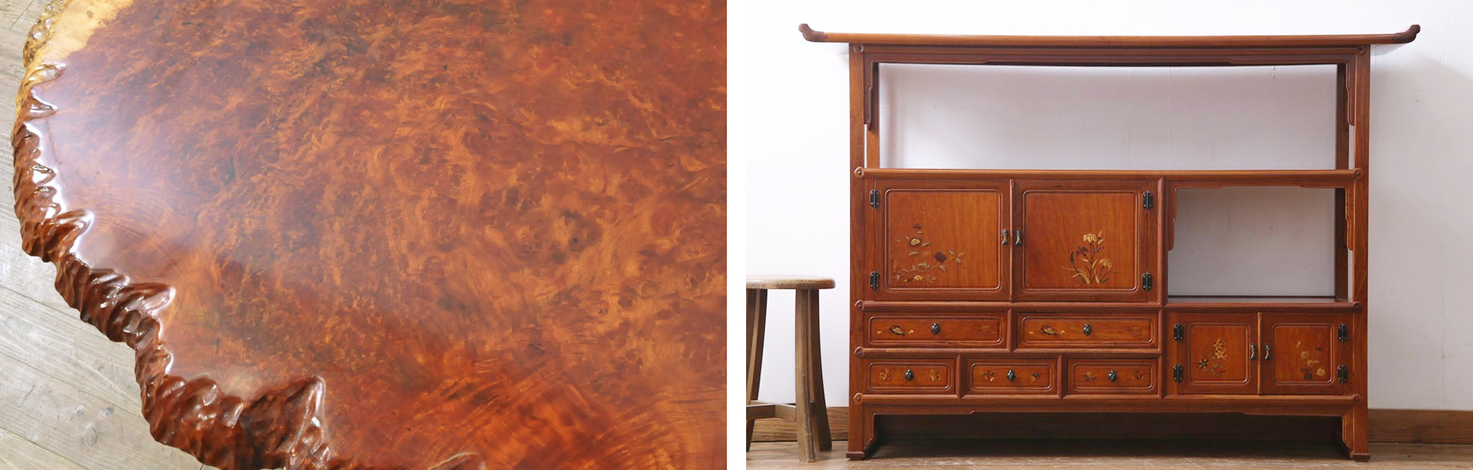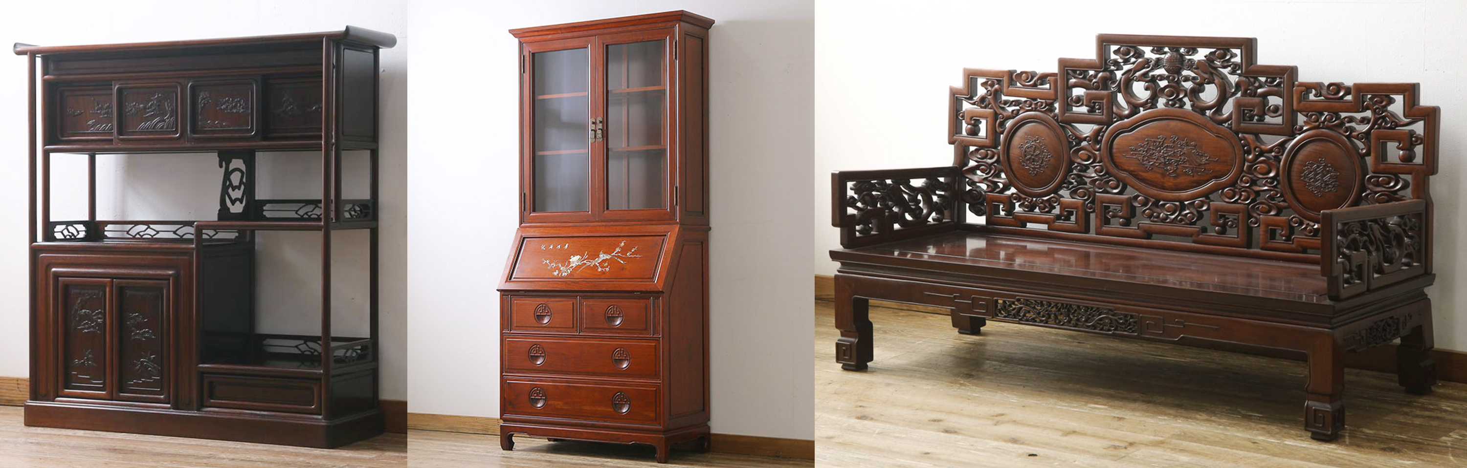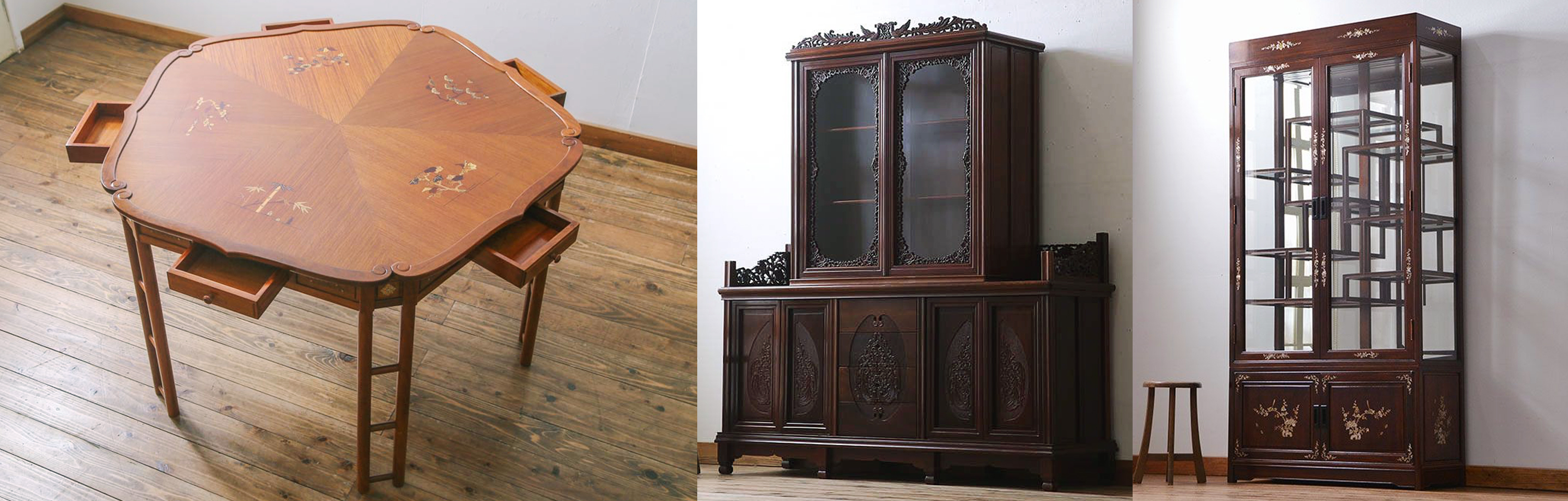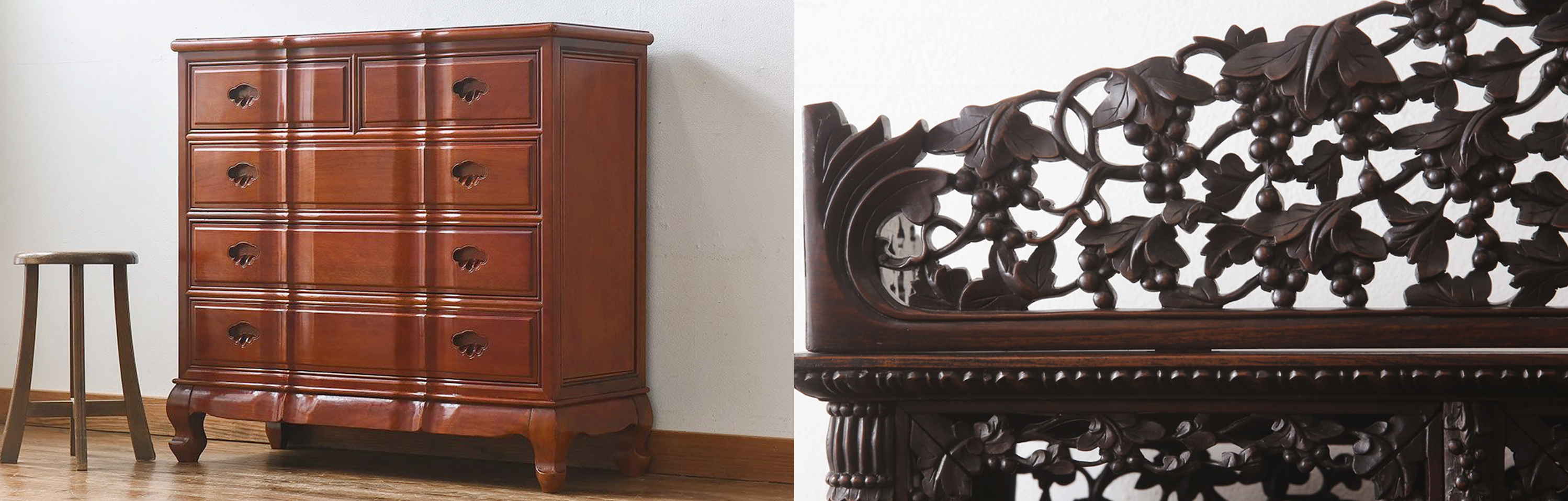 日本・中国・アジアにおける唐木のアンティーク家具には、唐木の美しさを際立たせたシンプルなデザインのものが多数ありますが、彫刻や蒔絵・螺鈿などを用いた華美なデザインのものも数多くあります。