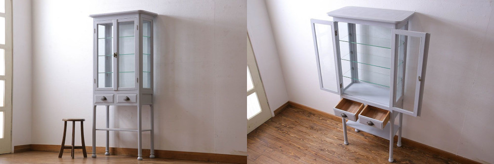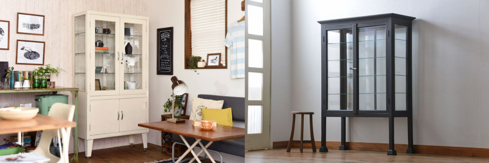 光を良く遠し清潔感のある3面ガラス張りのケビントは、見せる収納としてインテリアにマッチします。背面は板張りなので、壁際に寄せて使うのも良いですね。お気に入りのアイテムをディスプレイして見せる収納として活躍しますよ。