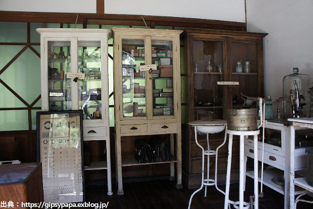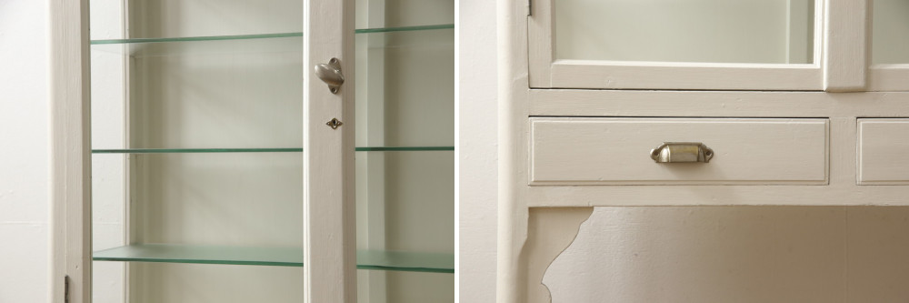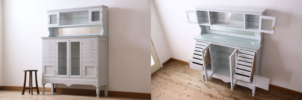 ガラス張りである理由は、収納した包帯や薬剤の残量・状態を一目で確認できるためであり、機能的な意味がありました。また、細かな引き出しには医療機器を使いやすく整理してしまえる特徴があり、医療用キャビネットとして充実した収納家具だったことが伺えます。